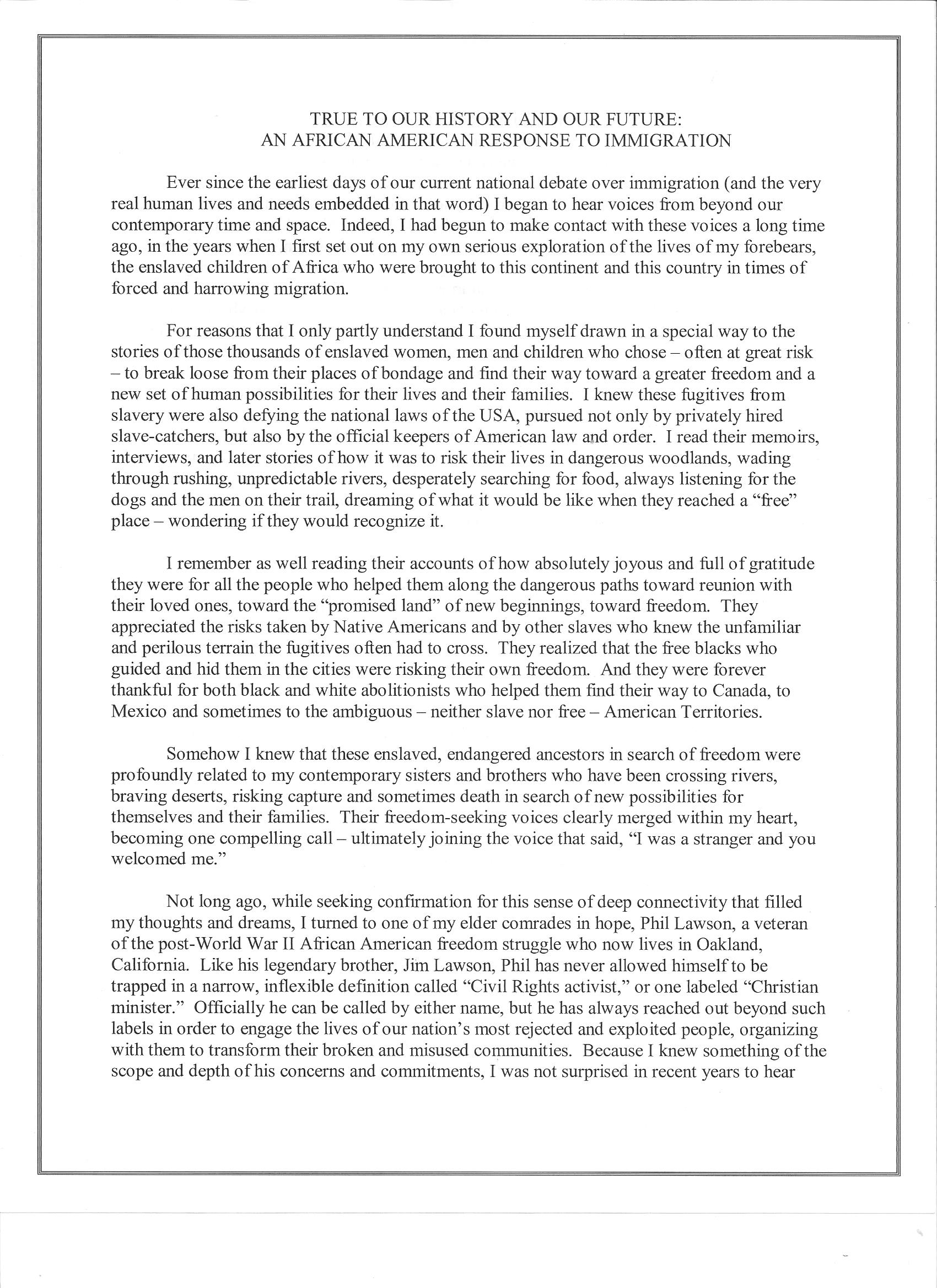 My father wrote this two-page statement on immigration in 2008. He used his experience as a historian and the commentary of his friend and comrade, Rev. Phil Lawson, to reflect on connections between the fugitive ancestors of African Americans and the imperative to be welcoming and merciful to those who are strangers in the place we call home. It’s a good and needed rebuke to the cruelty of the present administration’s policies.